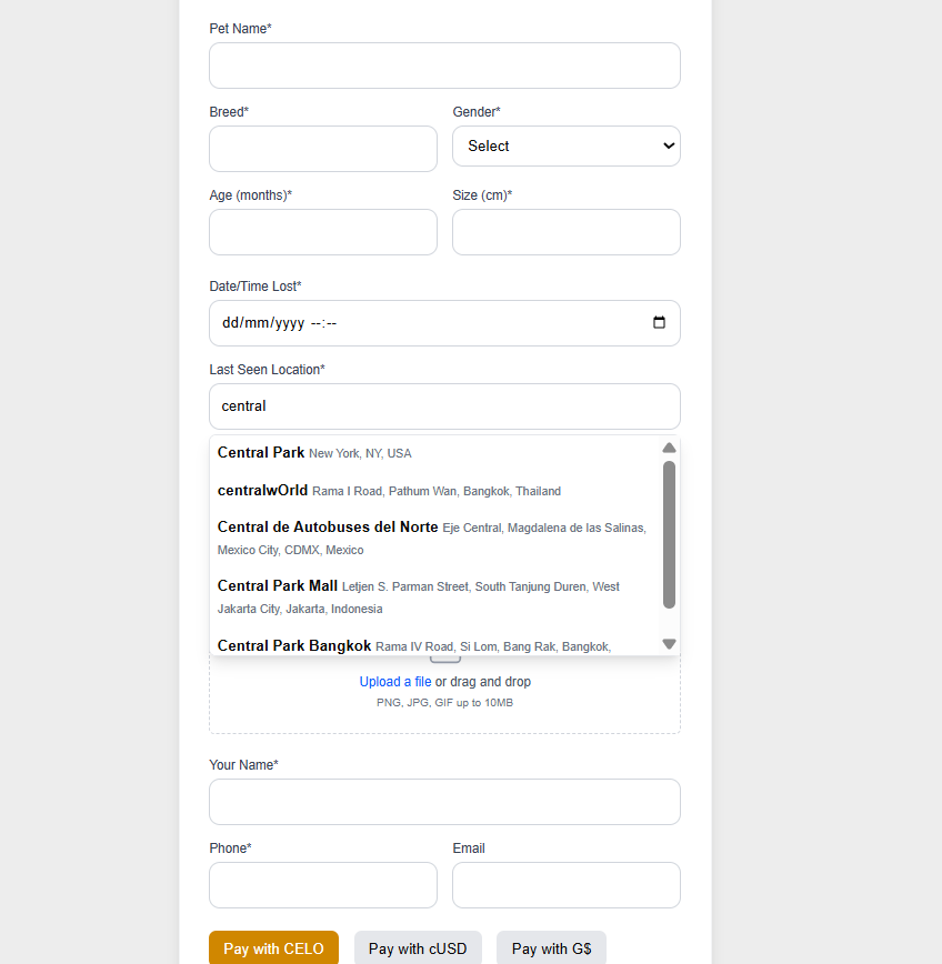 Ensures users can search for pet’s last seen location with accurate autocomplete.